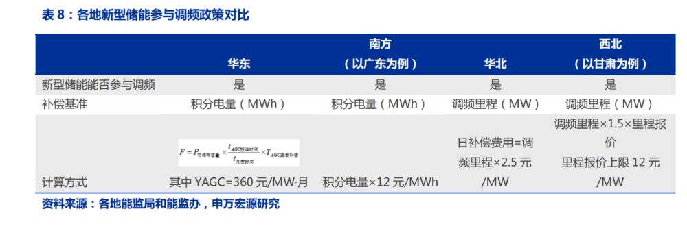 調(diào)頻輔助服務(wù)經(jīng)常因其名稱而讓人迷惑,但調(diào)頻輔助服務(wù)本質(zhì)上還是對電能量的調(diào)節(jié)。 調(diào)頻輔助服務(wù)理論上就是為了彌補調(diào)頻輔助服務(wù)是為了彌補電力市場和調(diào)峰輔助服務(wù)無法 解決的實時平衡問題,主要依靠自動控制技術(shù)來進行調(diào)整。 調(diào)頻已經(jīng)成為儲能的重要收入來源之一。各地陸續(xù)允許新型儲能參與調(diào)頻輔助服務(wù)市 場,而目前在多數(shù)地區(qū),調(diào)頻輔助服務(wù)已經(jīng)成為儲能最重要的收益來源。對于調(diào)頻輔助補 償基準,華東和南方區(qū)域采用積分電量(即調(diào)頻容量乘以調(diào)用時間),而華北和甘肅則采 用調(diào)頻里程(即調(diào)頻容量乘以調(diào)用次數(shù))。調(diào)頻補償?shù)挠嬎惴绞讲⒉恢匾?,重要的是看新型儲能參與調(diào)頻輔助服務(wù)相比于火電等傳統(tǒng)機組是否存在優(yōu)勢。華東、南方區(qū)域儲能與火 電相比,補償計算方式?jīng)]有任何區(qū)別。華北區(qū)域同等調(diào)頻里程情況下,儲能的補償費用僅 有火電的一半。而對于甘肅省,補償費用則高于火電。