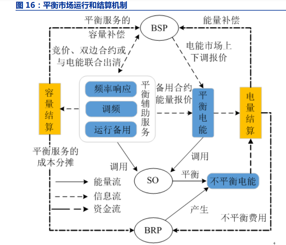 歐洲的平衡市場(chǎng)源于 2017 年 12 月 23 日歐盟委員會(huì) EB 條例,該條例給出一個(gè)指導(dǎo) 方針,使得各國(guó)可以在平衡市場(chǎng)中共享資源,從而使發(fā)電量始終與用電量相等。從實(shí)際達(dá) 成的效果來(lái)看,歐洲平衡市場(chǎng)與我國(guó)的調(diào)頻輔助服務(wù)類(lèi)似。 在平衡市場(chǎng)中,調(diào)度智能歸于 TSO 或者 DSO,參與平衡市場(chǎng)運(yùn)行和結(jié)算的市場(chǎng)成員 包括 BSP(BalanceServiceProvider,BSP)和 BRP(BalanceResponsibilityParty,BRP) 等。其中 BSP 提供平衡資源,在實(shí)際運(yùn)行中根據(jù)系統(tǒng)頻率變化或調(diào)度指令改變自身出力以 幫助系統(tǒng)恢復(fù)平衡,BRP 是承擔(dān)責(zé)任并參與不平衡結(jié)算的市場(chǎng)成員。