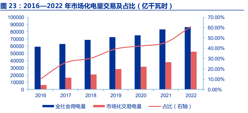 電力交易業(yè)務是電力市場化最直接收益的業(yè)務。由于電力市場的設計復雜,各地交易 規(guī)則、品種不一,同時也要求對整個電力系統(tǒng)的運行規(guī)律有深刻理解,是高度專業(yè)化的業(yè) 務,電力交易決策本身對于電力市場參與者的收益造成較大影響。 市場化售電規(guī)模有快速擴張潛力。根據(jù)中電聯(lián)相關數(shù)據(jù),2022 年我國市場化交易電量 規(guī)模達到 5.25 萬億千瓦時,占全社會總用電量的規(guī)模已超過 60%,考慮到優(yōu)先購用電,直 觀看起來售電規(guī)模增長空間有限。但實際上:(1)我國目前市場化交易電量大部分仍通過 電網(wǎng)代理購電,直接購電以及通過售電公司購電比例較低;(2)我國電力現(xiàn)貨市場才開始 推廣,雖然各地要求中長期電量占比要達到 70%—90%以上,但由于絕大多數(shù)省份現(xiàn)貨市 場均采用全電量結算,因此實際的現(xiàn)貨交易量可能會接近全社會用電量。以廣東省為例, 2022 年全省本地機組發(fā)電量 5844 億千瓦時,中長期交易電量 2871 億千瓦時,現(xiàn)貨市場 總交易量達 3801 億千瓦時。
