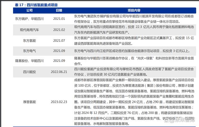 近年來四川省不斷落地氫能投資項(xiàng)目,產(chǎn)業(yè)蓄勢待發(fā)。2021年以來,四川省積極引導(dǎo)氫能項(xiàng)目投資落地:1)2021年2月24日,現(xiàn)代商用汽車在四川資陽投資22.3億元,重點(diǎn)強(qiáng)化氫燃料汽車在內(nèi)的新能源汽車產(chǎn)品的研發(fā)和生產(chǎn);2)2021年7月9日,東方氫能在四川成都市郫都區(qū)投資15億元建設(shè)西部氫能高端先進(jìn)裝備制造產(chǎn)業(yè)園區(qū),主要目的是導(dǎo)入四川省燃料電池重點(diǎn)實(shí)驗(yàn)室,打造氫能科技創(chuàng)新中心、制造中心、科普中心、運(yùn)維服務(wù)及大數(shù)據(jù)中心、應(yīng)用示范中心,積極引入產(chǎn)業(yè)上下游企業(yè),構(gòu)建燃料電池核心原材料及核心零部件企業(yè)集群;3)2021年9月8日,東方電氣與四川內(nèi)江經(jīng)開區(qū)簽約并擬投資3億元建設(shè)的加氫綜合能源示范站項(xiàng)目;4)2022年6月21日,四川能投氫能產(chǎn)業(yè)投資有限公司計劃在攀枝花市總投資30億元打造氫能全產(chǎn)業(yè)鏈基地。