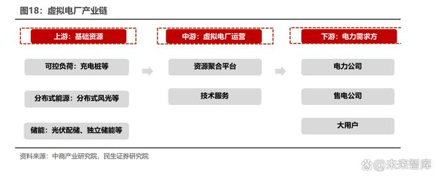 虛擬電廠產(chǎn)業(yè)鏈包括:上游基礎(chǔ)資源、中游虛擬電廠運營、下游電力需求方。 上游基礎(chǔ)資源由可控負荷、分布式能源與儲能構(gòu)成;中游是提供運營服務(wù)與技術(shù)支 持的虛擬電廠運營平臺;下游則由電力公司、售電公司、工業(yè)企業(yè)、商業(yè)用戶等電 力需求方構(gòu)成。