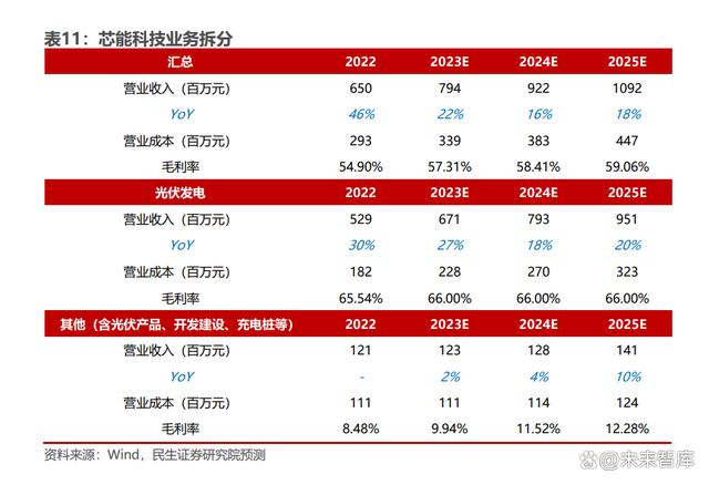 芯能科技業(yè)務(wù)拆分: 22 年業(yè)務(wù)結(jié)構(gòu)收入占比:光伏發(fā)電(81%)+光伏產(chǎn)品(12%)+開發(fā)建設(shè)(4%) +充電樁(1%)+其他業(yè)務(wù)(1%)。其中光伏產(chǎn)品、開發(fā)建設(shè)主要以配套光伏發(fā)電 業(yè)務(wù)為主。 光伏發(fā)電業(yè)務(wù):受益于大工業(yè)電價(jià)同比上調(diào)以及公司自持電站規(guī)模持續(xù)擴(kuò)大、光伏 發(fā)電量穩(wěn)步增加,同時,在分布式光伏整縣推進(jìn)背景下,EPC 及運(yùn)維服務(wù)業(yè)務(wù)的市 場空間進(jìn)一步打開,公司光伏發(fā)電業(yè)務(wù)穩(wěn)定增長。根據(jù)公司轉(zhuǎn)債問詢函回復(fù),未來 三年公司計(jì)劃以分布式光伏并網(wǎng)裝機(jī)容量不低于 15%的年化增長率持續(xù)擴(kuò)大自持分布式光伏電站建設(shè)投入,我們預(yù)計(jì)公司光伏發(fā)電業(yè)務(wù) 23-25 年收入增速分別為 27%/18%/20%。