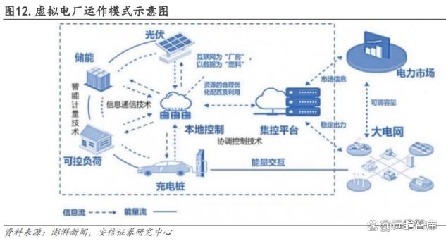 未來隨著電力市場(chǎng)成熟,工商業(yè)儲(chǔ)能也可以通過虛擬電廠以聚合的方式參與電力市場(chǎng)交易。虛擬電廠是應(yīng)用先進(jìn)的通訊和控制技術(shù),實(shí)現(xiàn)對(duì)大量散布的分布式資源的聚合調(diào)控,使這些分布式資源規(guī)?;⒕邆鋮⑴c電力系統(tǒng)運(yùn)行調(diào)度的資格和能力。“虛擬”的含義是這些資源并非真正的發(fā)電廠,而是對(duì)分布式資源的聚合,“電廠”的含義是能夠像真正的發(fā)電廠一樣為電力系統(tǒng)提供電能量和輔助服務(wù)。