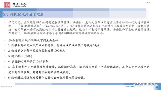 目前世界主流核電站皆采用第二代或第三代核電技術(shù)。其中,第二代和第三代的 主要核電堆型包括壓力堆和沸水堆等,在安全性和經(jīng)濟(jì)性上較前一代都有提升。第四代核電技術(shù)以在安全 性、經(jīng)濟(jì)性、核廢物處理、防止核擴(kuò)散上更為出色,代表堆型包括鈉冷快堆、鉛冷快堆、氣冷快堆、超高 溫氣冷堆等,目前主要研發(fā)試驗(yàn)階段,商業(yè)化預(yù)計(jì)在2030年左右實(shí)現(xiàn)。