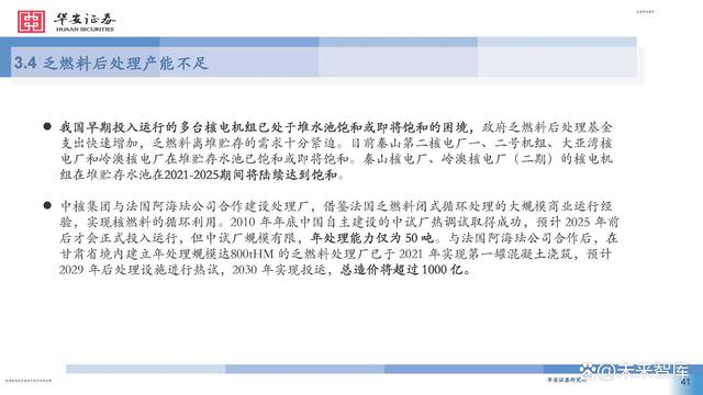 2007年,我國(guó)確定了符合國(guó)情的閉式燃料循環(huán)路線。乏燃料后處理屬于高精尖技術(shù),處理廠建設(shè)需耗時(shí)10 年。目前,法國(guó)、日本、印度等國(guó)乏燃料后處理產(chǎn)能已可覆蓋最新年產(chǎn)生量,而我國(guó)僅有中核四0四有限 公司于2010年投產(chǎn)的中試廠產(chǎn)能為50tHM/年。 隨著壓水堆裝機(jī)容量快速增長(zhǎng),我國(guó)乏燃料的總量也將迅速增長(zhǎng)。當(dāng)前,我國(guó)乏燃料后處理基礎(chǔ)研究與俄 羅斯、美國(guó)、法國(guó)等國(guó)仍存差距,后處理關(guān)鍵設(shè)備如剪切機(jī)、溶解器等仍有待進(jìn)一步研發(fā),尚未建成商用 后處理廠且不具備相應(yīng)的運(yùn)行經(jīng)驗(yàn)。