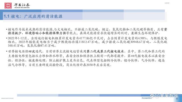 2022年1-12月,全國(guó)運(yùn)行核電機(jī)組累計(jì)發(fā)電量為4177.86億千瓦時(shí),占全國(guó)累計(jì)發(fā)電量的4.98%。與燃煤發(fā)電 相比,2022年核能發(fā)電相當(dāng)于減少燃燒標(biāo)準(zhǔn)煤11812.47萬(wàn)噸,減少排放二氧化碳30948.67萬(wàn)噸、二氧化硫 100.41萬(wàn)噸、氮氧化物87.41萬(wàn)噸。 世界核電歷經(jīng)四次迭代。