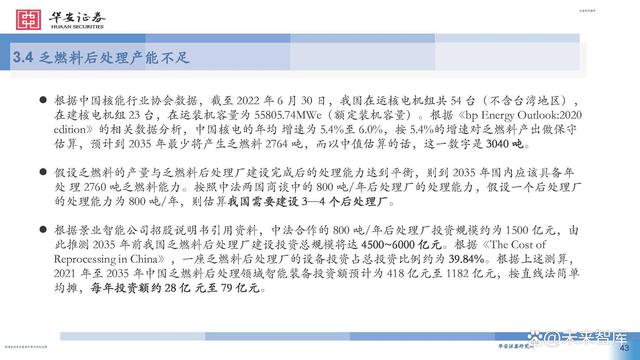 根據(jù)中國(guó)核能行業(yè)協(xié)會(huì)數(shù)據(jù),截至 2022 年 6 月 30 日,我國(guó)在運(yùn)核電機(jī)組共 54 臺(tái)(不含臺(tái)灣地區(qū)), 在建核電機(jī)組 23 臺(tái),在運(yùn)裝機(jī)容量為 55805.74MWe(額定裝機(jī)容量)。根據(jù)《bp Energy Outlook:2020 edition》的相關(guān)數(shù)據(jù)分析,中國(guó)核電的年均 增速為 5.4%至 6.0%,按 5.4%的增速對(duì)乏燃料產(chǎn)出做保守 估算,預(yù)計(jì)到 2035 年最少將產(chǎn)生乏燃料 2764 噸,而以中值估算的話,這一數(shù)字是 3040 噸。
