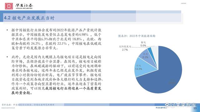 據(jù)中國(guó)核能行業(yè)協(xié)會(huì)發(fā)布的2022年能源產(chǎn)品產(chǎn)量統(tǒng)計(jì)數(shù) 據(jù)顯示,中國(guó)核能發(fā)電量?jī)H占總發(fā)電量的4.98% ,低于 中亞和東亞平均值6.3%相比于北美的 18.8% ,北歐、西 歐和南歐的 24.2% ,東歐的 22.1% ,中國(guó)核電在低碳政 策背景下的發(fā)展?jié)摿Ψ浅4蟆?此外,無(wú)論是國(guó)內(nèi)大規(guī)模上馬核電項(xiàng)目還是核電走向國(guó) 際市場(chǎng),其經(jīng)濟(jì)效益十分顯著。在國(guó)內(nèi),核電項(xiàng)目被稱 為印鈔機(jī),在雙碳減排的驅(qū)動(dòng)下,以前還受到電網(wǎng)調(diào)峰 要求的各核電站,近兩年來(lái)已經(jīng)是應(yīng)發(fā)盡發(fā),機(jī)組有效 利用小時(shí)數(shù)紛紛創(chuàng)出新高,電廠效益節(jié)節(jié)攀升。核電項(xiàng) 目投資也受到各地方政府和各大銀行的大力支持和追捧。 作為一個(gè)政策導(dǎo)向型顯著的行業(yè),近年來(lái)迎來(lái)了密集的 政策利好,可以預(yù)見我國(guó)核電行業(yè)將迎來(lái)一個(gè)高質(zhì)量發(fā) 展的黃金期。