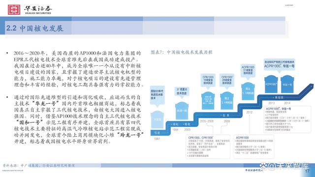 2016~2020年,美國(guó)西屋的AP1000和法國(guó)電力集團(tuán)的 EPR三代核電技術(shù)全球首堆先后在我國(guó)成功建成投產(chǎn)。 我國(guó)在過去近40年中,成為全球唯一一個(gè)從沒有中斷核 電項(xiàng)目建設(shè)的國(guó)家,且掌握了建造世界主流核電機(jī)型的 能力,施工能力卓越,對(duì)于核電項(xiàng)目的建設(shè)有先進(jìn)管理 理念和豐富的經(jīng)驗(yàn),對(duì)核電工期具備強(qiáng)有力的掌控能力。