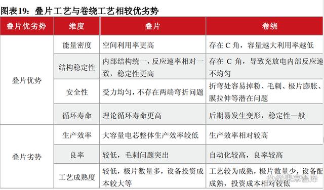 因此疊片工藝的電池理論上擁有更高體積能量密度上限、更穩(wěn)定的內(nèi)部結(jié)構(gòu)和更長的循環(huán)次數(shù)。全模切極耳數(shù)量變?yōu)閮杀?,可解決電子電導(dǎo)的集流問題,提升電池快充性能。此外,疊片技術(shù)還可減少Pack零部件數(shù)量,提升電池集成度,有利于減少儲能系統(tǒng)占地面積和土建支出。