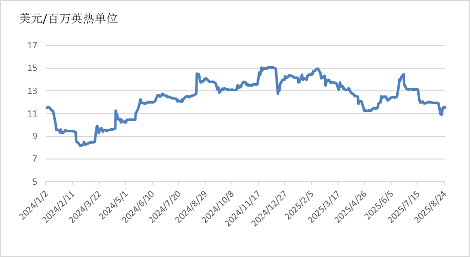 截至8月25日,普氏日韓LNG(JKM)期貨價格收于11.55美元/百萬英熱單位,月環(huán)比下降2.74%,相較2024年同期的13.82美元/百萬英熱單位,下降16.43%。